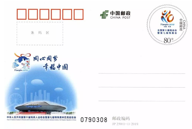 中国邮政定于2019年8月25日发行《中华人民共和国第十届残疾人运动会暨第七届特殊奥林匹克运动会》纪念邮资明信片1套1枚。详情如下: