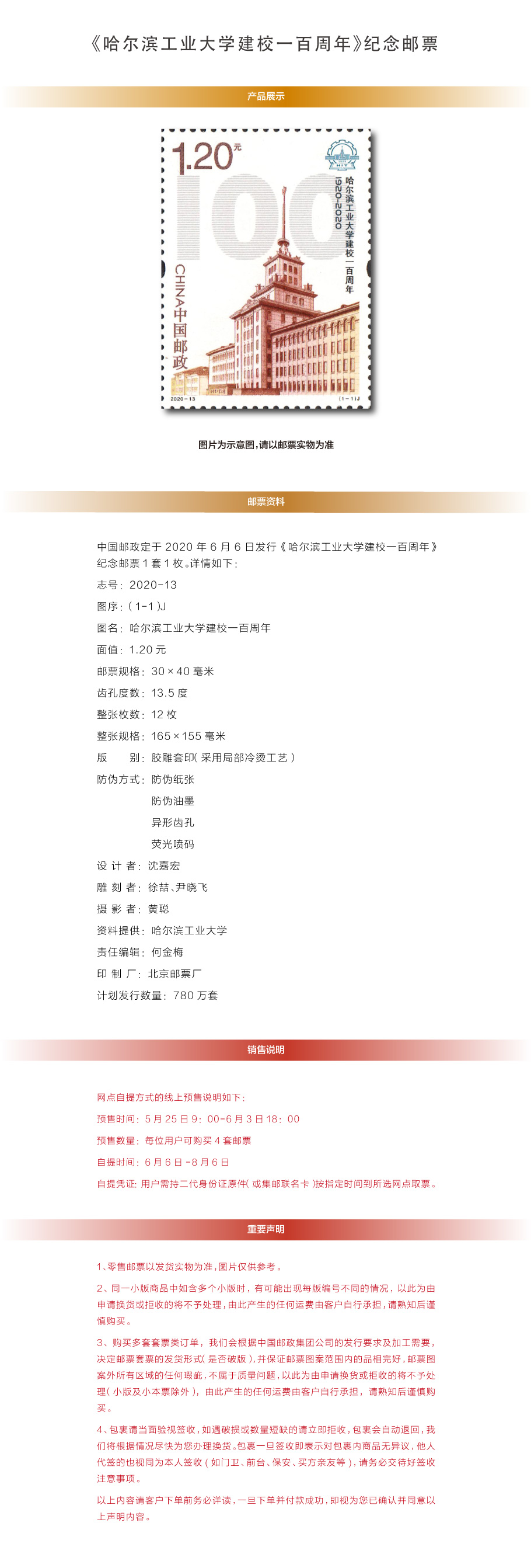 2020-13《哈尔滨工业大学建校一百周年》邮票6月6日发行