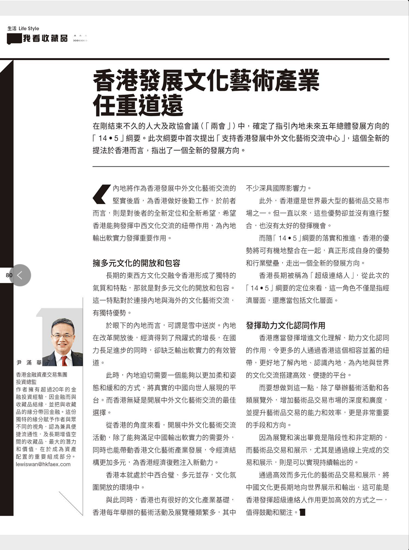 香港长期被称为“超级联系人”,从此次十四五纲要的定位来看,这一角色不仅是指经济层面,还应当包括文化层面。香港应当发挥增进文化理解、助力文化认同的作用,令更多的人通过香港这个相容并蓄的纽带,更好地了解中国、认识中国,为中国与世界的文化交流搭建高效、便捷的平台。而要想做到这一点,除了举办艺术活动和各类展览之外,增加艺术品交易市场的深度和广度,提升艺术品交易的能力和效率更是非常重要的手段和方向。因为展览和演出毕竟是阶段性和非定期的,而艺术品交易和展示尤其是通过在线完成的交易和展示,则是可以实现持续输出的。通过高效而多元化的艺术品交易和展示,将中国文化更长期地向世界展示和输出,这可能是香港发挥超级联系人作用更加高效的方式之一,值得鼓励和关注。